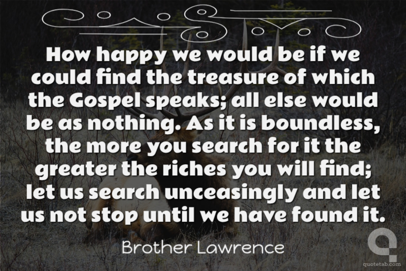 How happy we would be if we could find the treasure of which the Gospel speaks; all else would be as nothing. As it is boundless, the more you search for it the greater the riches you will find; let us search unceasingly and let us not stop until we have found it. Brother Lawrence