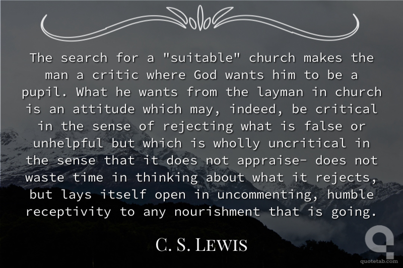 The search for a "suitable" church makes the man a critic where God wants him to be a pupil. What he wants from the layman in church is an attitude which may, indeed, be critical in the sense of rejecting what is false or unhelpful but which is wholly uncritical in the sense that it does not appraise- does not waste time in thinking about what it rejects, but lays itself open in uncommenting, humble receptivity to any nourishment that is going. C. S. Lewis