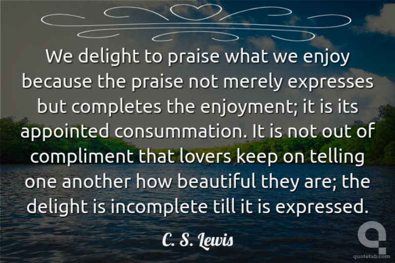 We delight to praise what we enjoy because the praise not merely expresses but completes the enjoyment; it is its appointed consummation. It is not out of compliment that lovers keep on telling one another how beautiful they are; the delight is incomplete till it is expressed. C. S. Lewis