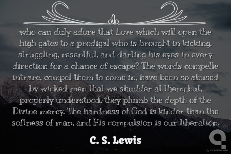 who can duly adore that Love which will open the high gates to a prodigal who is brought in kicking, struggling, resentful, and darting his eyes in every direction for a chance of escape? The words compelle intrare, compel them to come in, have been so abused by wicked men that we shudder at them; but, properly understood, they plumb the depth of the Divine mercy. The hardness of God is kinder than the softness of man, and His compulsion is our liberation. C. S. Lewis