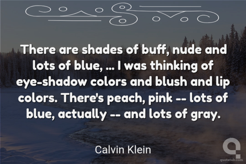 There are shades of buff, nude and lots of blue, ... I was thinking of eye-shadow colors and blush and lip colors. There's peach, pink -- lots of blue, actually -- and lots of gray. Calvin Klein