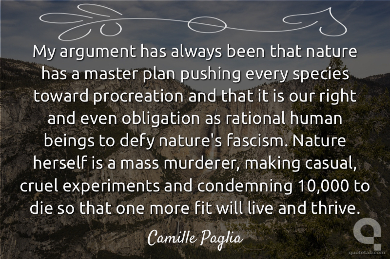 My argument has always been that nature has a master plan pushing every species toward procreation and that it is our right and even obligation as rational human beings to defy nature's fascism. Nature herself is a mass murderer, making casual, cruel experiments and condemning 10,000 to die so that one more fit will live and thrive. Camille Paglia