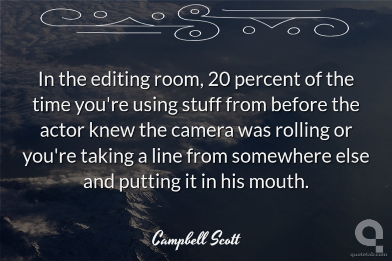 In the editing room, 20 percent of the time you're using stuff from before the actor knew the camera was rolling or you're taking a line from somewhere else and putting it in his mouth. Campbell Scott