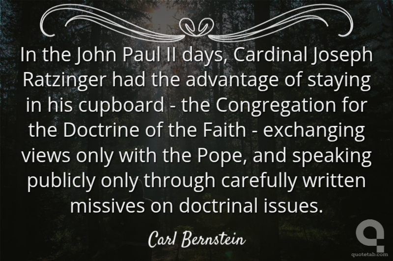 In the John Paul II days, Cardinal Joseph Ratzinger had the advantage of staying in his cupboard - the Congregation for the Doctrine of the Faith - exchanging views only with the Pope, and speaking publicly only through carefully written missives on doctrinal issues. Carl Bernstein