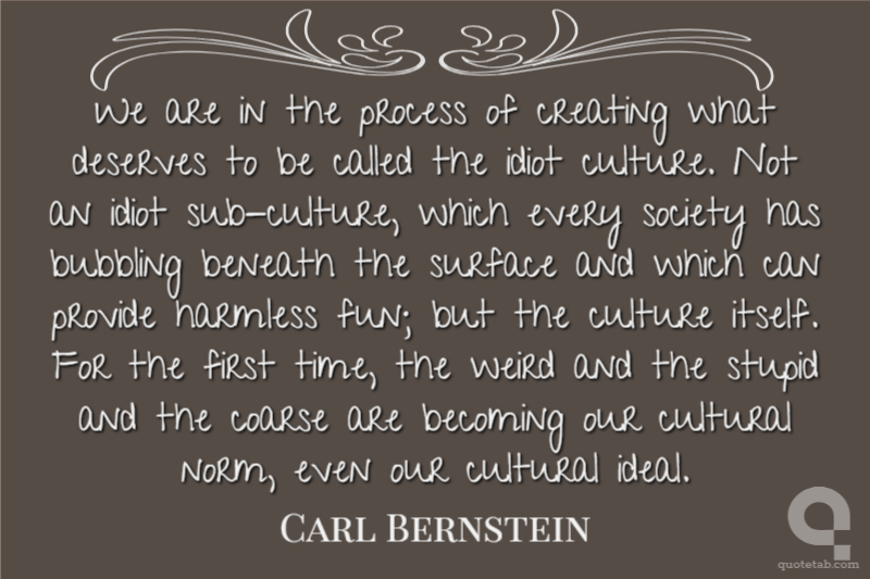 We are in the process of creating what deserves to be called the idiot culture. Not an idiot sub-culture, which every society has bubbling beneath the surface and which can provide harmless fun; but the culture itself. For the first time, the weird and the stupid and the coarse are becoming our cultural norm, even our cultural ideal. Carl Bernstein