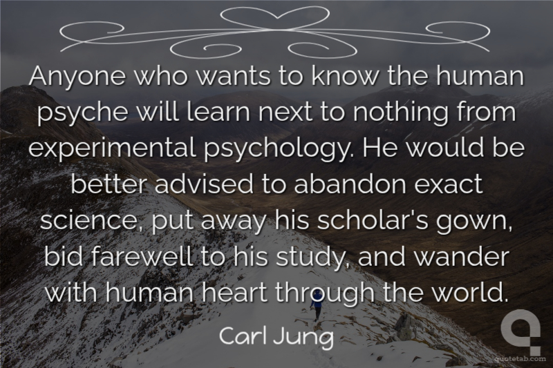 Anyone who wants to know the human psyche will learn next to nothing from experimental psychology. He would be better advised to abandon exact science, put away his scholar's gown, bid farewell to his study, and wander with human heart through the world. Carl Jung
