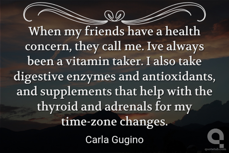 When my friends have a health concern, they call me. Ive always been a vitamin taker. I also take digestive enzymes and antioxidants, and supplements that help with the thyroid and adrenals for my time-zone changes. Carla Gugino