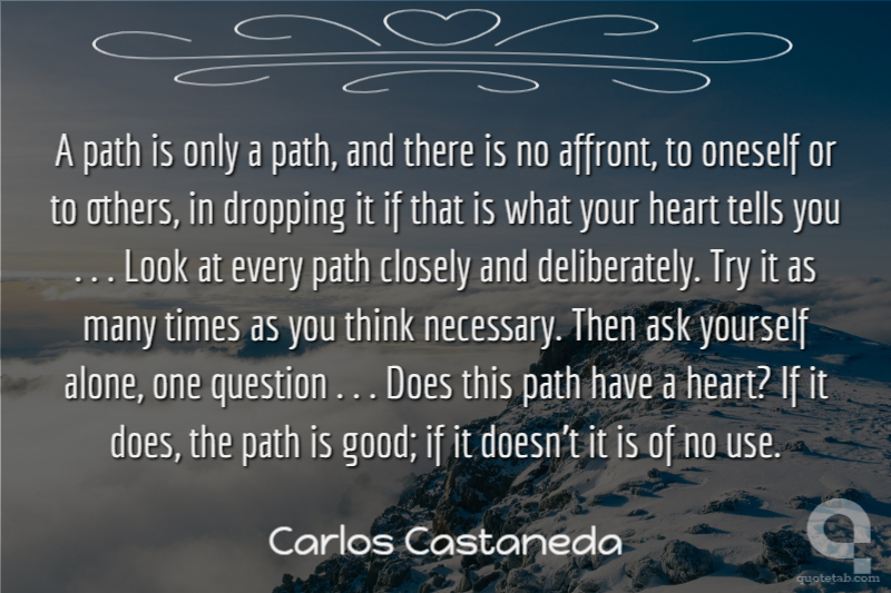A path is only a path, and there is no affront, to oneself or to others, in dropping it if that is what your heart tells you . . . Look at every path closely and deliberately. Try it as many times as you think necessary. Then ask yourself alone, one question . . . Does this path have a heart? If it does, the path is good; if it doesn't it is of no use. Carlos Castaneda