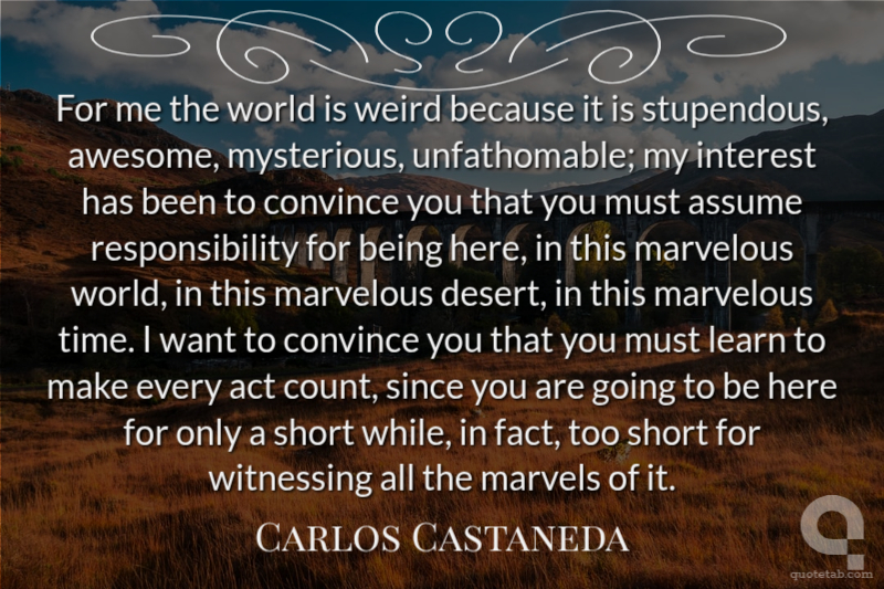For me the world is weird because it is stupendous, awesome, mysterious, unfathomable; my interest has been to convince you that you must assume responsibility for being here, in this marvelous world, in this marvelous desert, in this marvelous time. I want to convince you that you must learn to make every act count, since you are going to be here for only a short while, in fact, too short for witnessing all the marvels of it. Carlos Castaneda