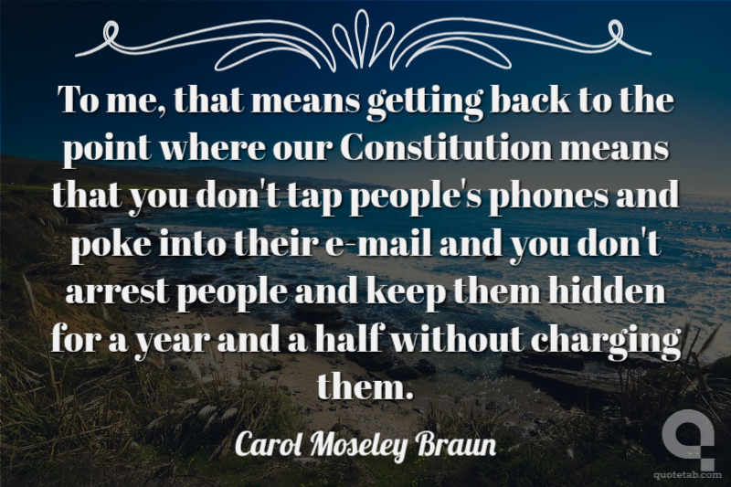To me, that means getting back to the point where our Constitution means that you don't tap people's phones and poke into their e-mail and you don't arrest people and keep them hidden for a year and a half without charging them. Carol Moseley Braun