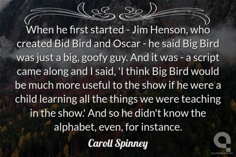 When he first started - Jim Henson, who created Bid Bird and Oscar - he said Big Bird was just a big, goofy guy. And it was - a script came along and I said, 'I think Big Bird would be much more useful to the show if he were a child learning all the things we were teaching in the show.' And so he didn't know the alphabet, even, for instance. Caroll Spinney