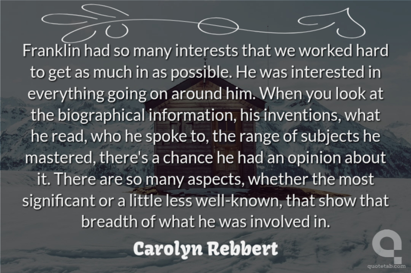 Franklin had so many interests that we worked hard to get as much in as possible. He was interested in everything going on around him. When you look at the biographical information, his inventions, what he read, who he spoke to, the range of subjects he mastered, there's a chance he had an opinion about it. There are so many aspects, whether the most significant or a little less well-known, that show that breadth of what he was involved in. Carolyn Rebbert