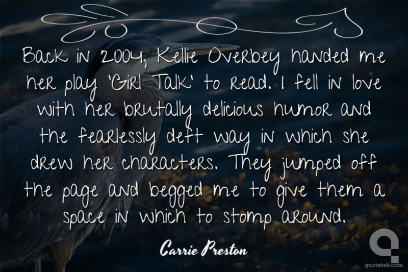 Back in 2004, Kellie Overbey handed me her play 'Girl Talk' to read. I fell in love with her brutally delicious humor and the fearlessly deft way in which she drew her characters. They jumped off the page and begged me to give them a space in which to stomp around. Carrie Preston