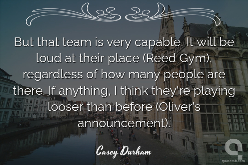 But that team is very capable. It will be loud at their place (Reed Gym), regardless of how many people are there. If anything, I think they're playing looser than before (Oliver's announcement). Casey Durham