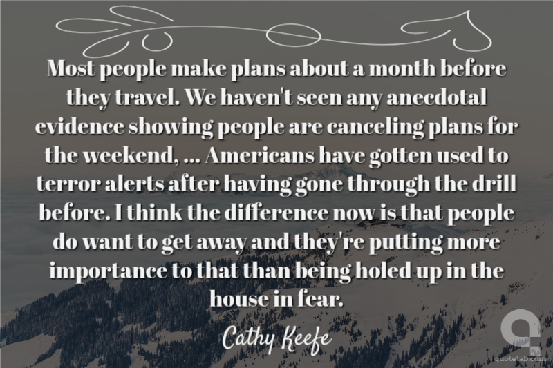 Most people make plans about a month before they travel. We haven't seen any anecdotal evidence showing people are canceling plans for the weekend, ... Americans have gotten used to terror alerts after having gone through the drill before. I think the difference now is that people do want to get away and they're putting more importance to that than being holed up in the house in fear. Cathy Keefe