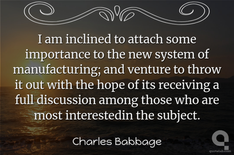I am inclined to attach some importance to the new system of manufacturing; and venture to throw it out with the hope of its receiving a full discussion among those who are most interestedin the subject. Charles Babbage