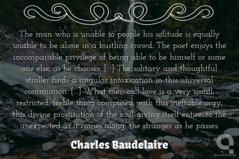 The man who is unable to people his solitude is equally unable to be alone in a bustling crowd. The poet enjoys the incomparable privilege of being able to be himself or some one else, as he chooses. [...] The solitary and thoughtful stroller finds a singular intoxication in this universal communion. [...] What men call love is a very small, restricted, feeble thing compared with this ineffable orgy, this divine prostitution of the soul giving itself entire...to the unexpected as it comes along, the stranger as he passes. Charles Baudelaire