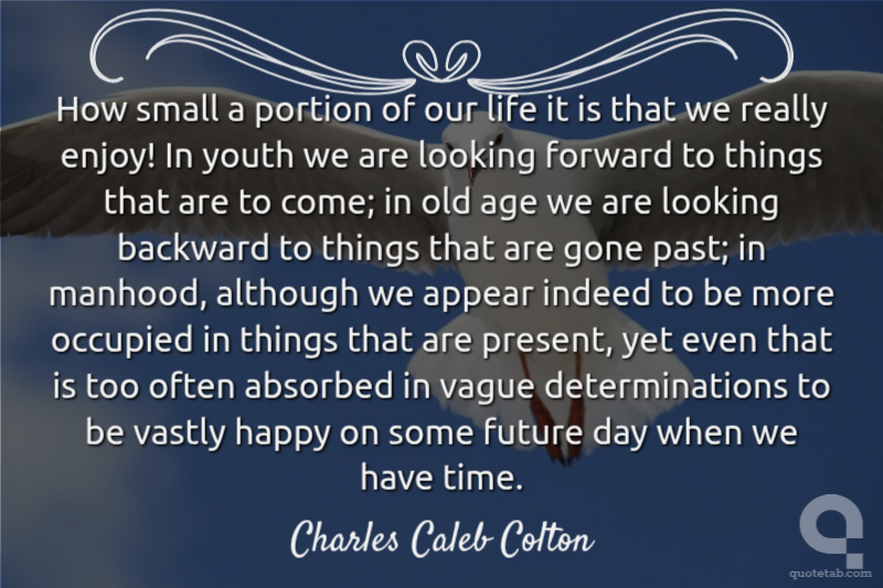 How small a portion of our life it is that we really enjoy! In youth we are looking forward to things that are to come; in old age we are looking backward to things that are gone past; in manhood, although we appear indeed to be more occupied in things that are present, yet even that is too often absorbed in vague determinations to be vastly happy on some future day when we have time. Charles Caleb Colton