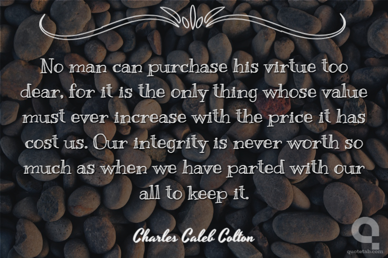 No man can purchase his virtue too dear, for it is the only thing whose value must ever increase with the price it has cost us. Our integrity is never worth so much as when we have parted with our all to keep it. Charles Caleb Colton