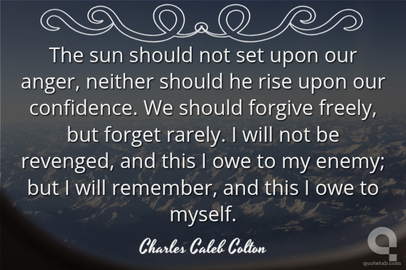 The sun should not set upon our anger, neither should he rise upon our confidence. We should forgive freely, but forget rarely. I will not be revenged, and this I owe to my enemy; but I will remember, and this I owe to myself. Charles Caleb Colton
