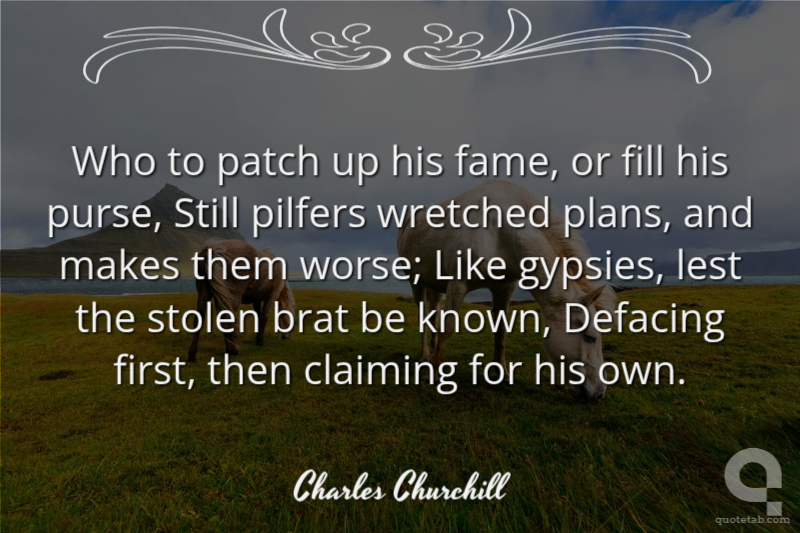 Who to patch up his fame, or fill his purse, Still pilfers wretched plans, and makes them worse; Like gypsies, lest the stolen brat be known, Defacing first, then claiming for his own. Charles Churchill