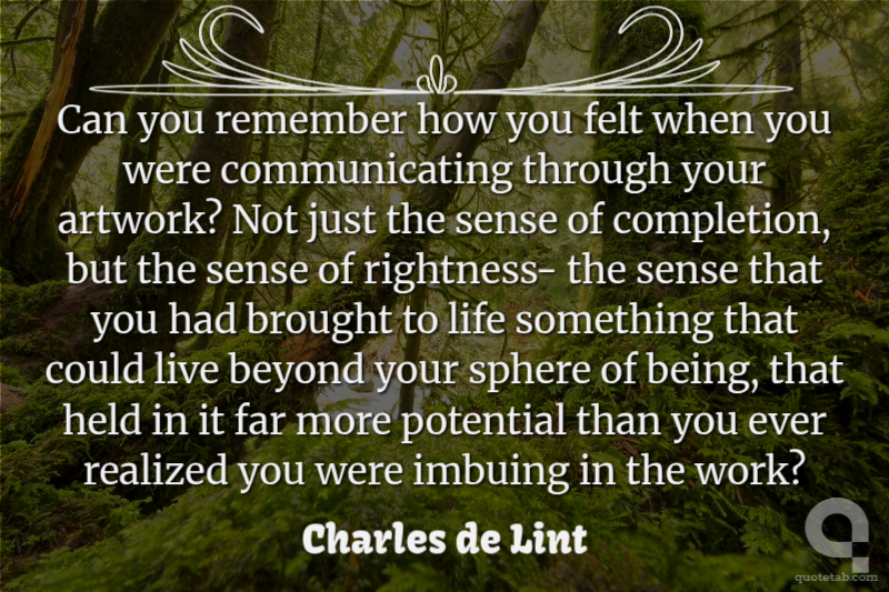 Can you remember how you felt when you were communicating through your artwork? Not just the sense of completion, but the sense of rightness- the sense that you had brought to life something that could live beyond your sphere of being, that held in it far more potential than you ever realized you were imbuing in the work? Charles de Lint