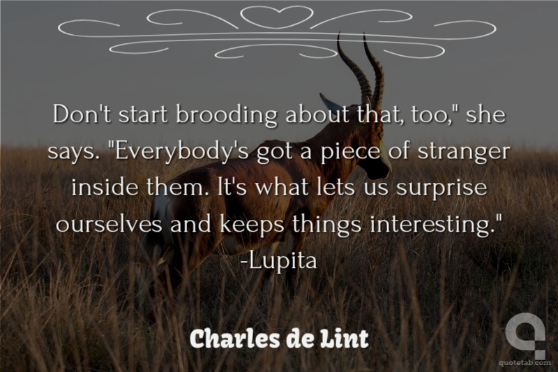 Don't start brooding about that, too," she says. "Everybody's got a piece of stranger inside them. It's what lets us surprise ourselves and keeps things interesting." -Lupita Charles de Lint