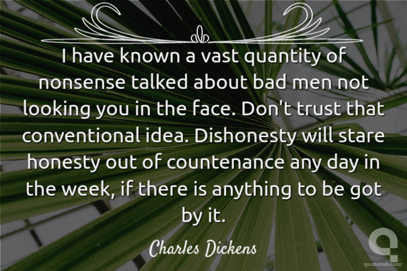 I have known a vast quantity of nonsense talked about bad men not looking you in the face. Don't trust that conventional idea. Dishonesty will stare honesty out of countenance any day in the week, if there is anything to be got by it. Charles Dickens