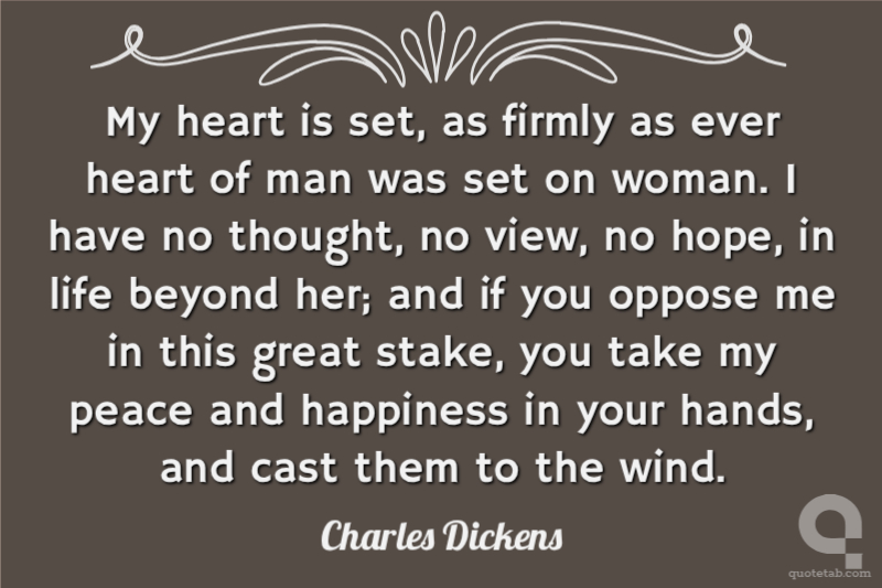 My heart is set, as firmly as ever heart of man was set on woman. I have no thought, no view, no hope, in life beyond her; and if you oppose me in this great stake, you take my peace and happiness in your hands, and cast them to the wind. Charles Dickens