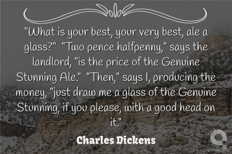 "What is your best, your very best, ale a glass?" "Two pence halfpenny," says the landlord, "is the price of the Genuine Stunning Ale." "Then," says I, producing the money, "just draw me a glass of the Genuine Stunning, if you please, with a good head on it." Charles Dickens