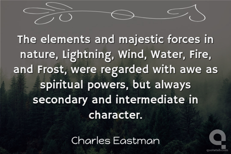 The elements and majestic forces in nature, Lightning, Wind, Water, Fire, and Frost, were regarded with awe as spiritual powers, but always secondary and intermediate in character. Charles Eastman
