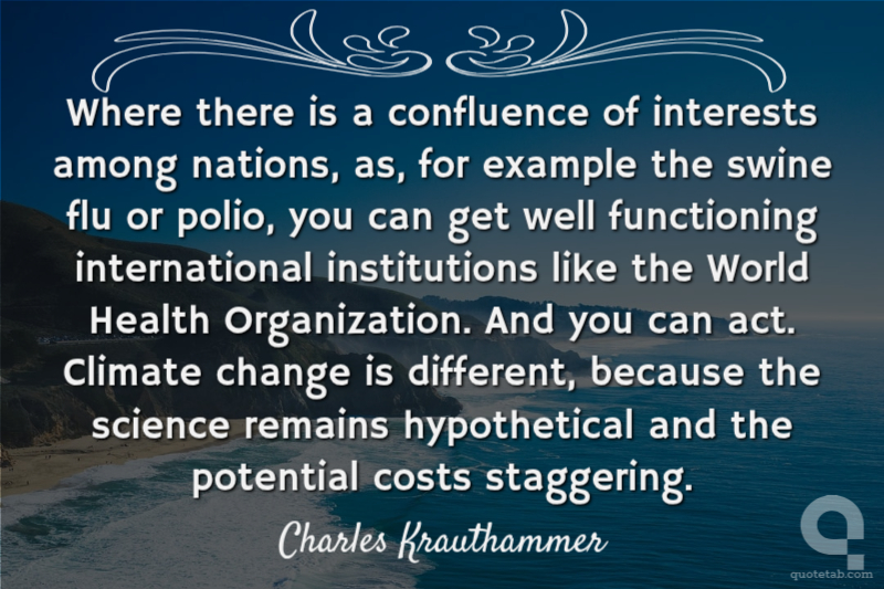 Where there is a confluence of interests among nations, as, for example the swine flu or polio, you can get well functioning international institutions like the World Health Organization. And you can act. Climate change is different, because the science remains hypothetical and the potential costs staggering. Charles Krauthammer