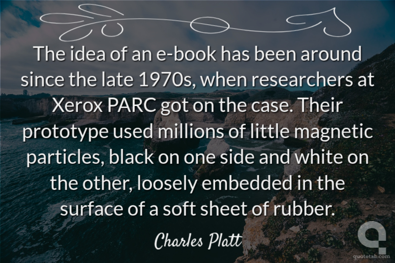 The idea of an e-book has been around since the late 1970s, when researchers at Xerox PARC got on the case. Their prototype used millions of little magnetic particles, black on one side and white on the other, loosely embedded in the surface of a soft sheet of rubber. Charles Platt