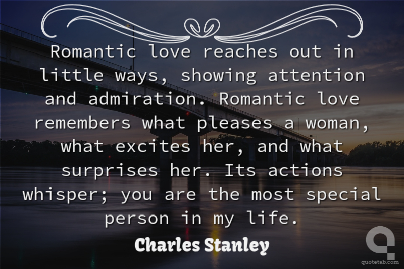 Romantic love reaches out in little ways, showing attention and admiration. Romantic love remembers what pleases a woman, what excites her, and what surprises her. Its actions whisper; you are the most special person in my life. Charles Stanley