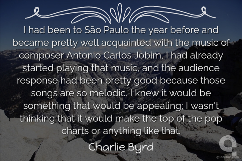 I had been to São Paulo the year before and became pretty well acquainted with the music of composer Antonio Carlos Jobim, I had already started playing that music, and the audience response had been pretty good because those songs are so melodic. I knew it would be something that would be appealing; I wasn't thinking that it would make the top of the pop charts or anything like that. Charlie Byrd