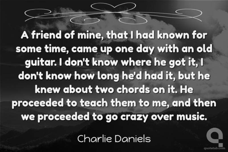 A friend of mine, that I had known for some time, came up one day with an old guitar. I don't know where he got it, I don't know how long he'd had it, but he knew about two chords on it. He proceeded to teach them to me, and then we proceeded to go crazy over music. Charlie Daniels