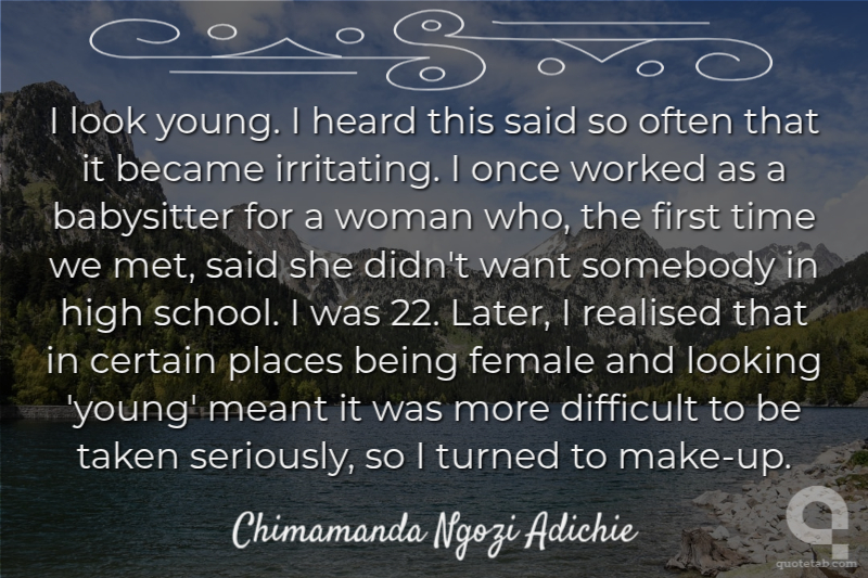 I look young. I heard this said so often that it became irritating. I once worked as a babysitter for a woman who, the first time we met, said she didn't want somebody in high school. I was 22. Later, I realised that in certain places being female and looking 'young' meant it was more difficult to be taken seriously, so I turned to make-up. Chimamanda Ngozi Adichie
