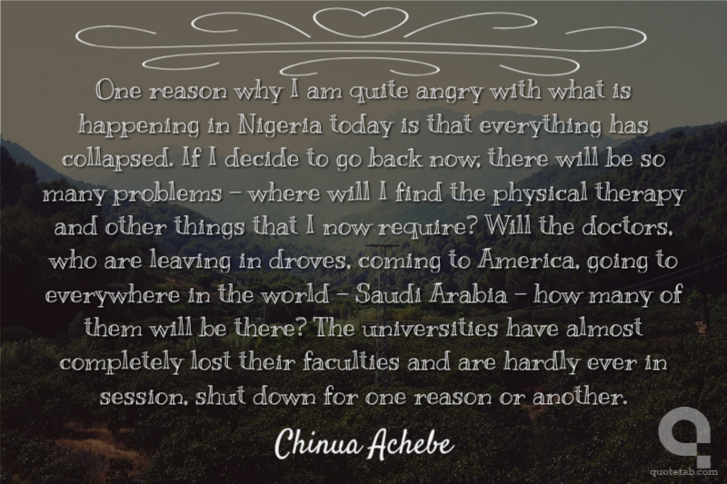 One reason why I am quite angry with what is happening in Nigeria today is that everything has collapsed. If I decide to go back now, there will be so many problems - where will I find the physical therapy and other things that I now require? Will the doctors, who are leaving in droves, coming to America, going to everywhere in the world - Saudi Arabia - how many of them will be there? The universities have almost completely lost their faculties and are hardly ever in session, shut down for one reason or another. Chinua Achebe