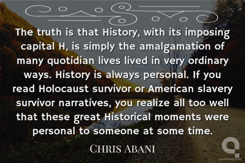 The truth is that History, with its imposing capital H, is simply the amalgamation of many quotidian lives lived in very ordinary ways. History is always personal. If you read Holocaust survivor or American slavery survivor narratives, you realize all too well that these great Historical moments were personal to someone at some time. Chris Abani