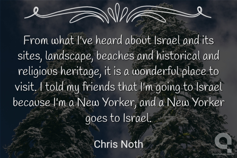 From what I've heard about Israel and its sites, landscape, beaches and historical and religious heritage, it is a wonderful place to visit. I told my friends that I'm going to Israel because I'm a New Yorker, and a New Yorker goes to Israel. Chris Noth