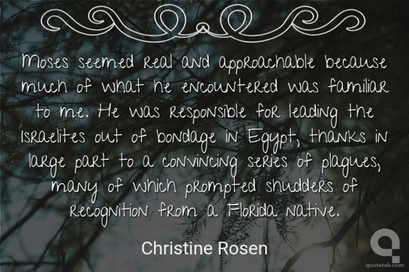 Moses seemed real and approachable because much of what he encountered was familiar to me. He was responsible for leading the Israelites out of bondage in Egypt, thanks in large part to a convincing series of plagues, many of which prompted shudders of recognition from a Florida native. Christine Rosen