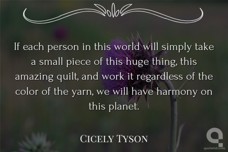 If each person in this world will simply take a small piece of this huge thing, this amazing quilt, and work it regardless of the color of the yarn, we will have harmony on this planet. Cicely Tyson