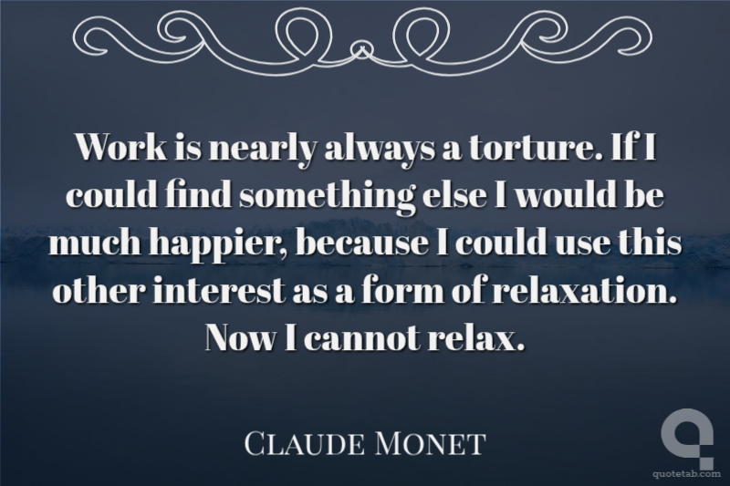 Work is nearly always a torture. If I could find something else I would be much happier, because I could use this other interest as a form of relaxation. Now I cannot relax. Claude Monet