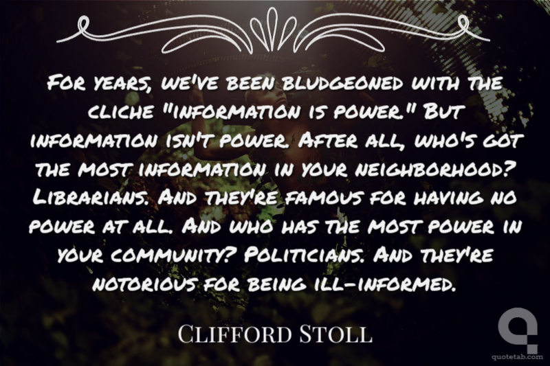 For years, we've been bludgeoned with the cliche "information is power." But information isn't power. After all, who's got the most information in your neighborhood? Librarians. And they're famous for having no power at all. And who has the most power in your community? Politicians. And they're notorious for being ill-informed. Clifford Stoll