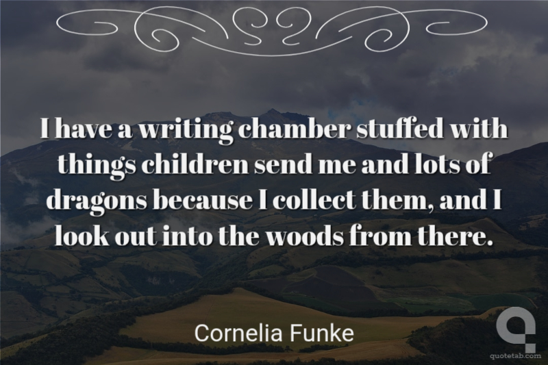 I have a writing chamber stuffed with things children send me and lots of dragons because I collect them, and I look out into the woods from there. Cornelia Funke
