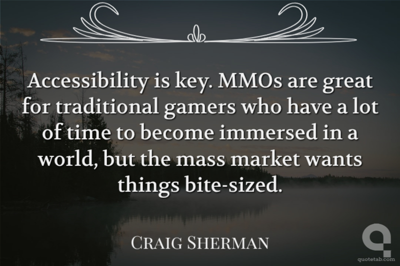 Accessibility is key. MMOs are great for traditional gamers who have a lot of time to become immersed in a world, but the mass market wants things bite-sized. Craig Sherman