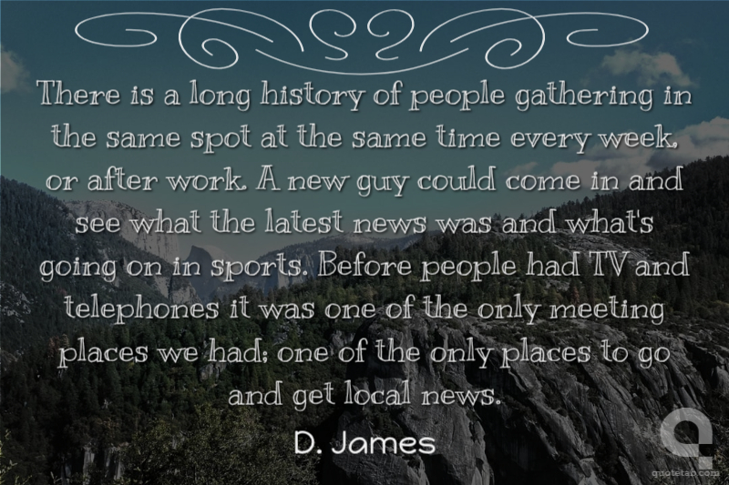 There is a long history of people gathering in the same spot at the same time every week, or after work. A new guy could come in and see what the latest news was and what's going on in sports. Before people had TV and telephones it was one of the only meeting places we had; one of the only places to go and get local news. D. James