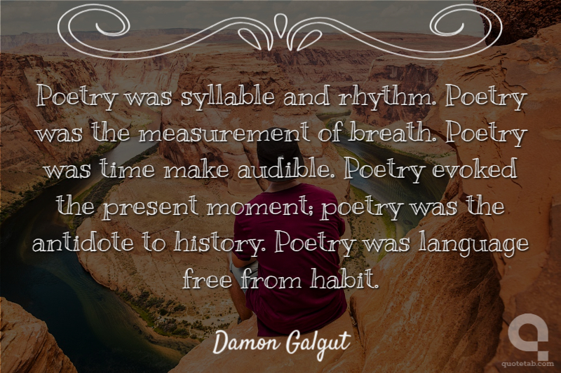 Poetry was syllable and rhythm. Poetry was the measurement of breath. Poetry was time make audible. Poetry evoked the present moment; poetry was the antidote to history. Poetry was language free from habit. Damon Galgut