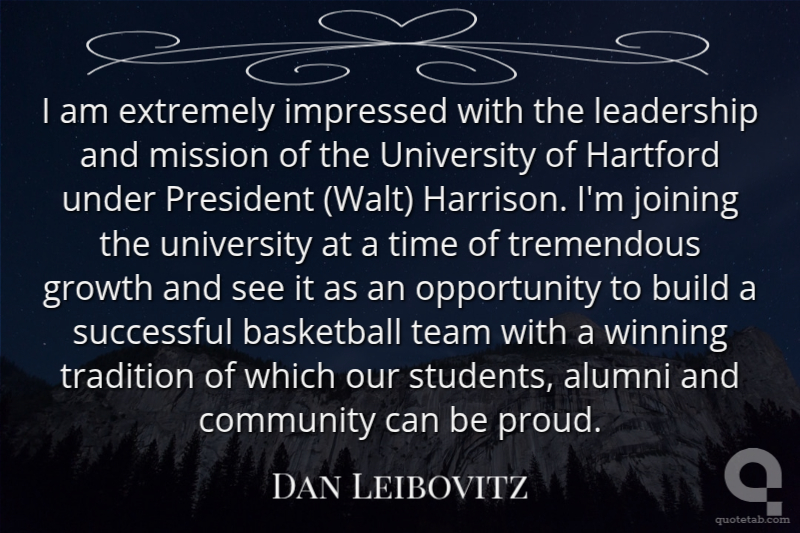 I am extremely impressed with the leadership and mission of the University of Hartford under President (Walt) Harrison. I'm joining the university at a time of tremendous growth and see it as an opportunity to build a successful basketball team with a winning tradition of which our students, alumni and community can be proud. Dan Leibovitz