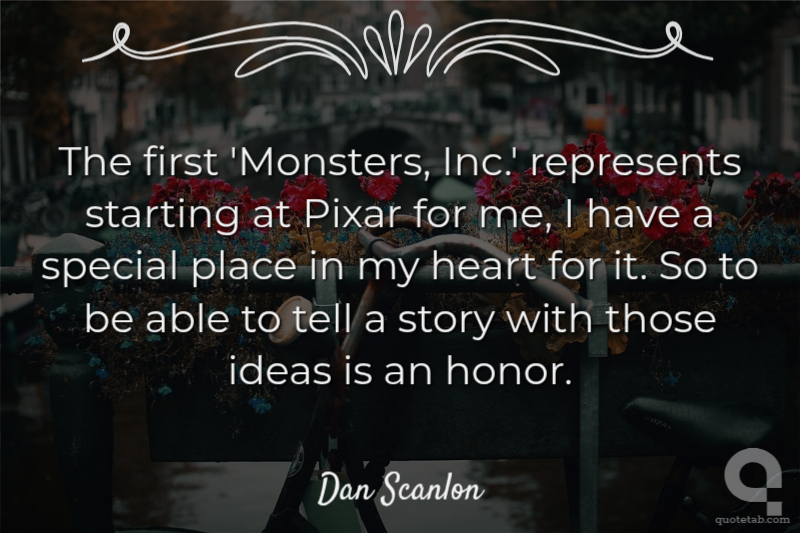 The first 'Monsters, Inc.' represents starting at Pixar for me, I have a special place in my heart for it. So to be able to tell a story with those ideas is an honor. Dan Scanlon